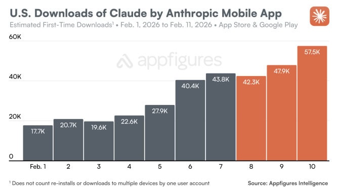 Según datos de Appfigures, Claude sumó en EE. UU. unas 148.000 descargas en iOS y Android entre el domingo y el martes posteriores a la Super Bowl. Es un 32% más que las cerca de 112.000 descargas del tramo anterior, de jueves a sábado.