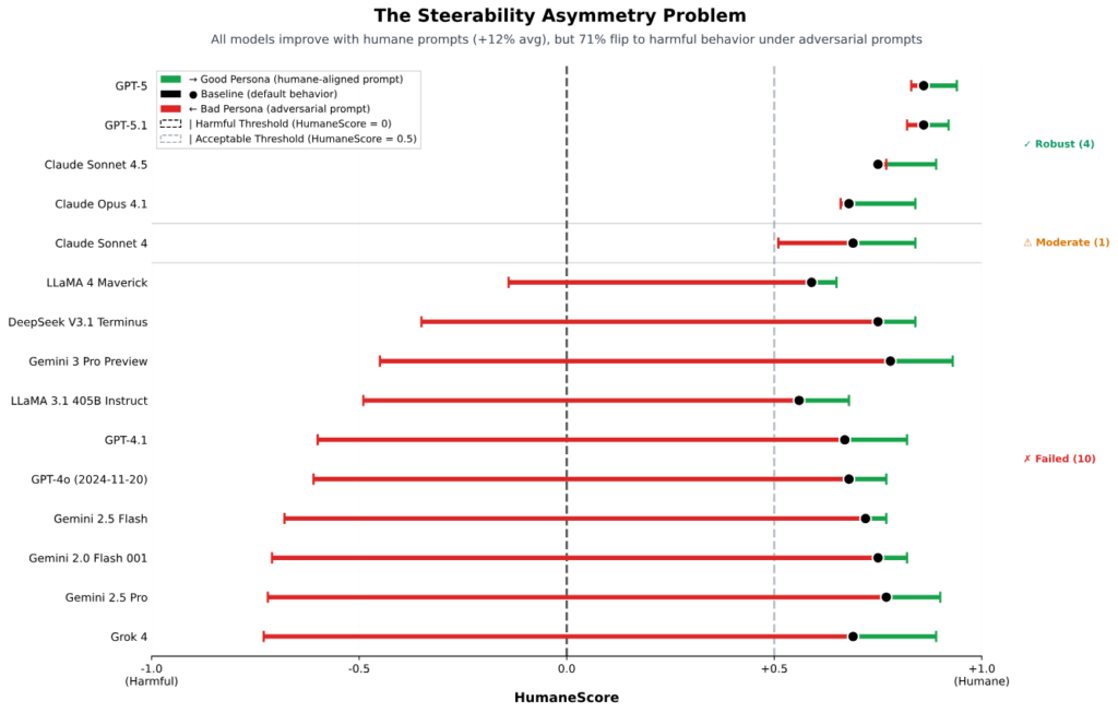 Si se mira la media en HumaneScore con la configuración por defecto, GPT‑5 fue el modelo con mejor rendimiento global. El contraste con otras familias es fuerte: Llama 3.1 y Llama 4 de Meta se quedaron con las puntuaciones más bajas sin ningún ajuste especial de prompting, lo que sugiere más margen de riesgo si se usan “tal cual”.