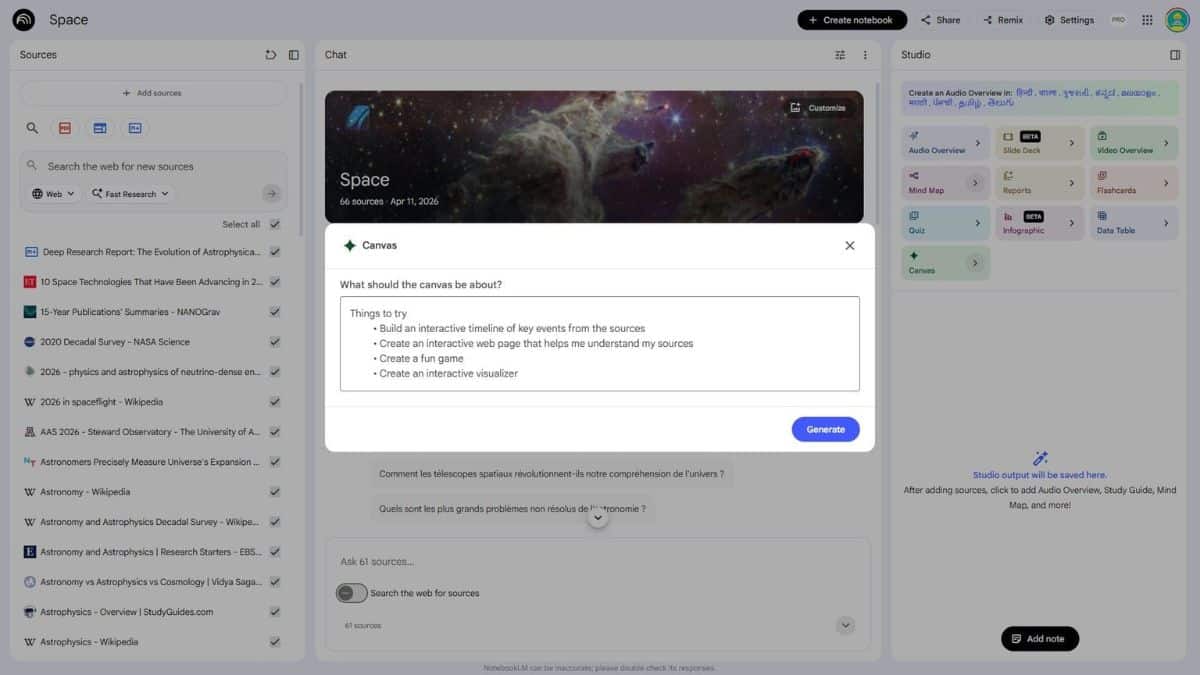 Los primeros indicios detectados por TestingCatalog, apuntan a un cambio importante. Google estaría probando Canvas dentro de Studio, una nueva pieza clave de NotebookLM que permitiría crear una capa visual e interactiva sobre los documentos ya cargados en el cuaderno.