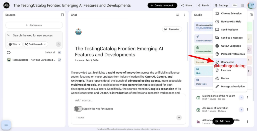 Google también estaría preparando Connectors (conectores, enlaces entre servicios), una opción en configuración que indica futuras integraciones con otras herramientas. Lo más probable es que el primer cableado llegue desde el propio ecosistema de Google. Eso cambiaría el flujo de trabajo de fondo. En lugar de añadir archivos y enlaces de forma manual, NotebookLM podría convertirse en una capa central de investigación conectada a distintos espacios donde ya vive la información del usuario.