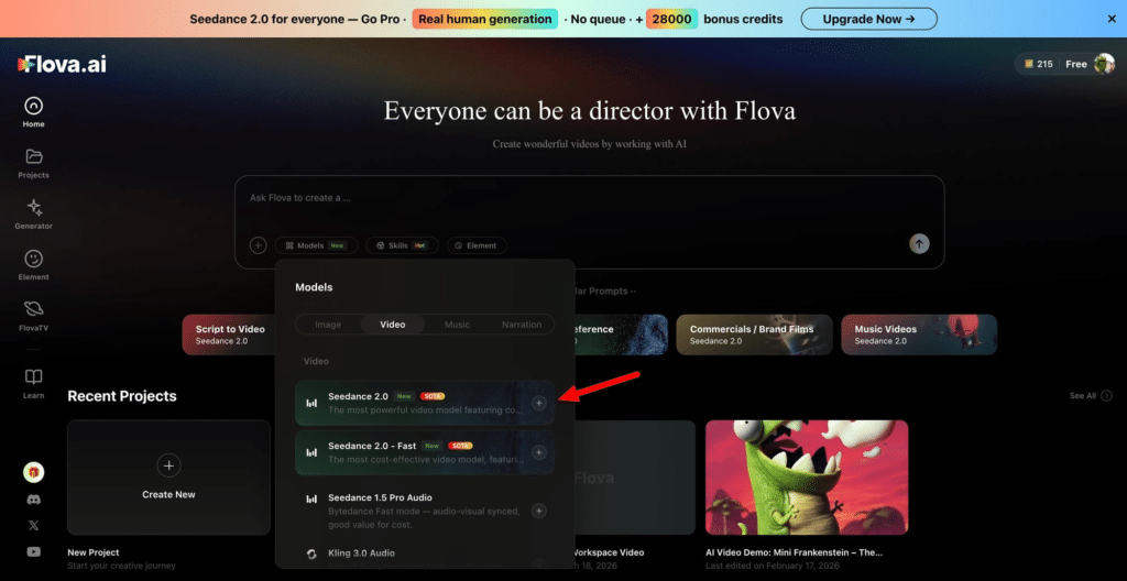 Evidentemente, la intención de Flova no es quedarse como un simple cascarón que te cobra un margen por conectar una API externa. Quieren ser tu única pestaña abierta. La nueva integración llega con una función de acceso rápido en la interfaz para lanzar Seedance o su modelo hermano NanoBanana con apenas un clic. Cero configuraciones de servidor, cero parámetros oscuros en consola.