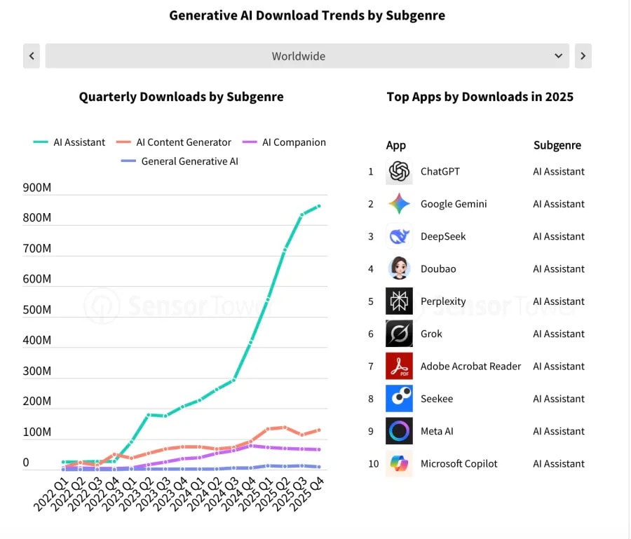 Entre los principales editores de IA, OpenAI y DeepSeek concentraron casi el 50% de las descargas globales, frente al 21% del año anterior. El patrón es conocido: primero hay decenas de apps, luego quedan unas pocas, y finalmente dos o tres se reparten el mercado.