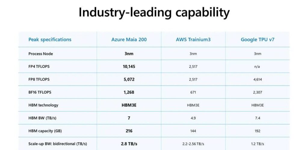 En una nota de prensa, Microsoft afirma que Maia ofrece tres veces el rendimiento FP4 de los chips Amazon Trainium de tercera generación, atacando justo donde más importa en inferencia: alto rendimiento con baja precisión.
