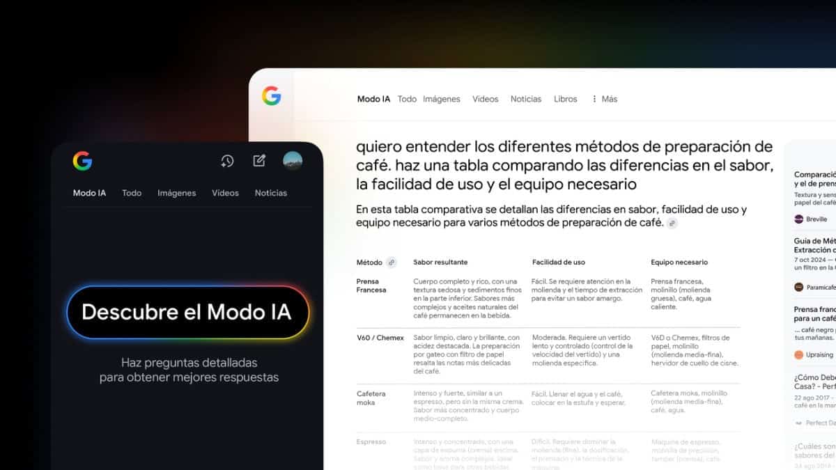 Imagina que preguntas “métodos para preparar café en casa”. El Modo IA de Google puede devolver una comparativa y, en la misma conversación, te permite afinar con “¿qué grosor de molido conviene para cada método?”. A continuación, verías algo parecido a esto:
