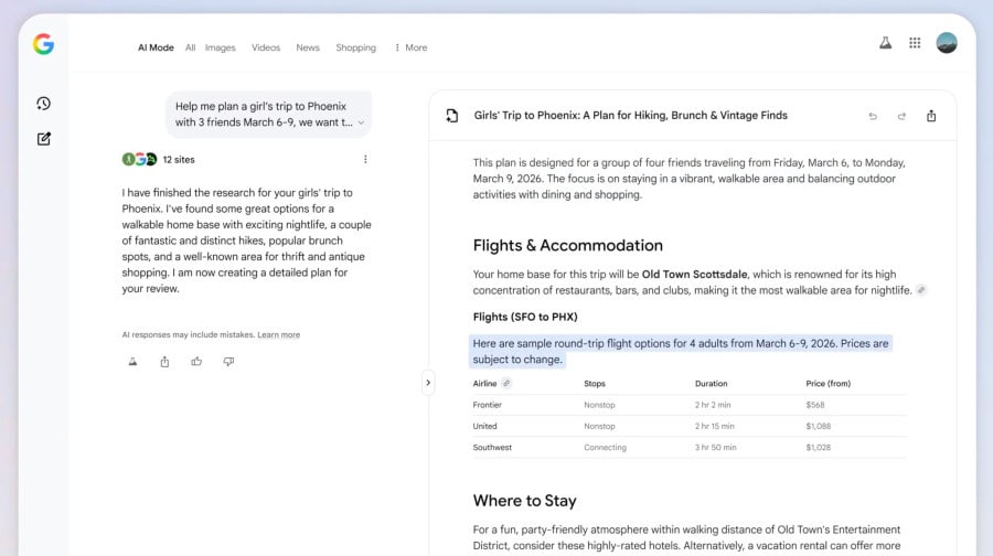 AI Mode es un modo del buscador que transforma tu idea de viaje en un itinerario Canvas listo para revisar y editar. La versión web te muestra un panel lateral con vuelos, hoteles y actividades recomendadas, y vas a poder ajustar el plan con peticiones en lenguaje natural.